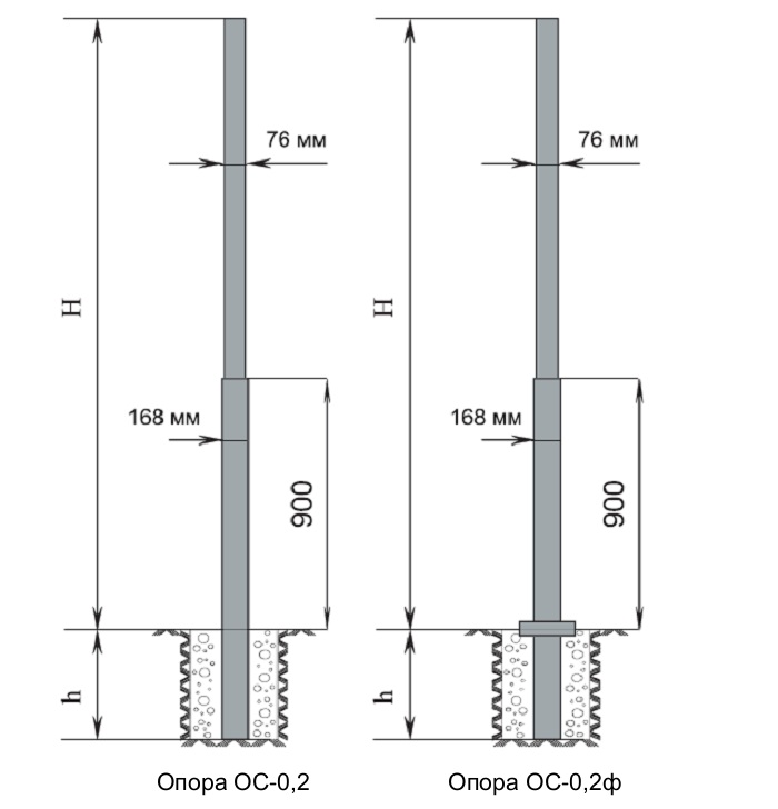 Обозначение опоры | Н, м рабочая высота (высота надземной части) | Н1, м рекомендуемая высота фундаментального блока | АхА, мм размер опорного сланца | Масса, кг |