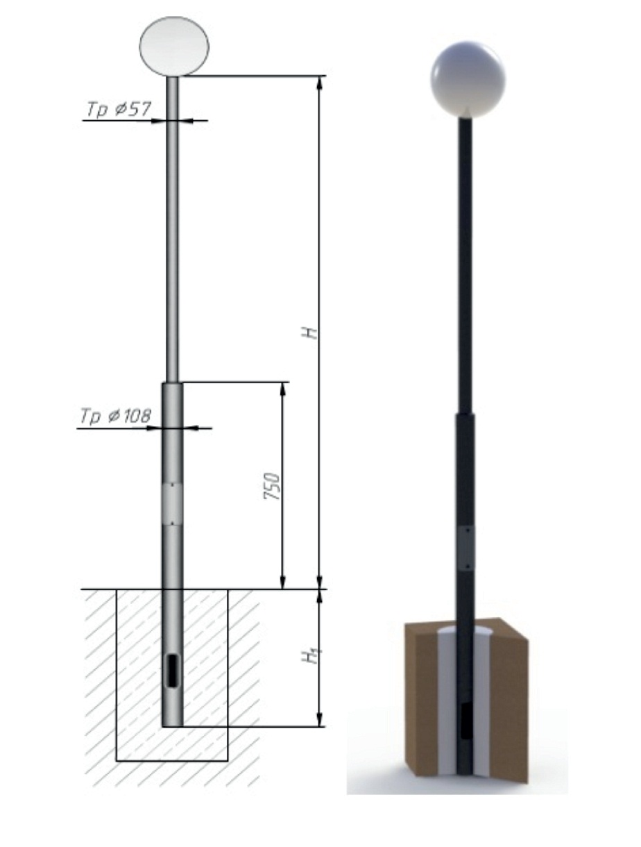 Устанавливается прямостоечная парковая опора в грунтовый котлован. Затем торшерная опора центрируется, после чего котлован бетонируется.